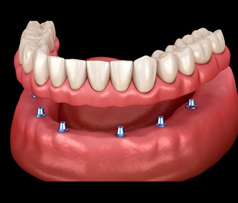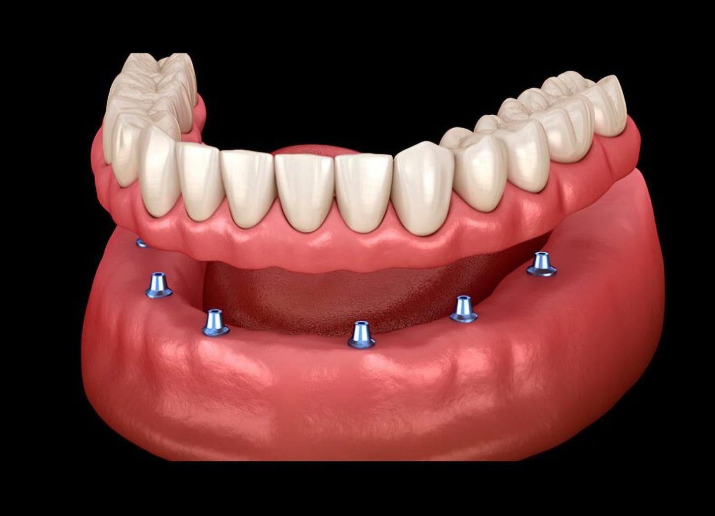 Prótese tipo dentadura fixada em vários implantes, não sai da boca.