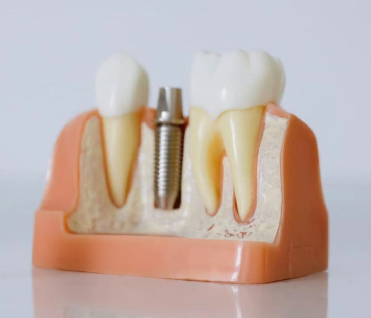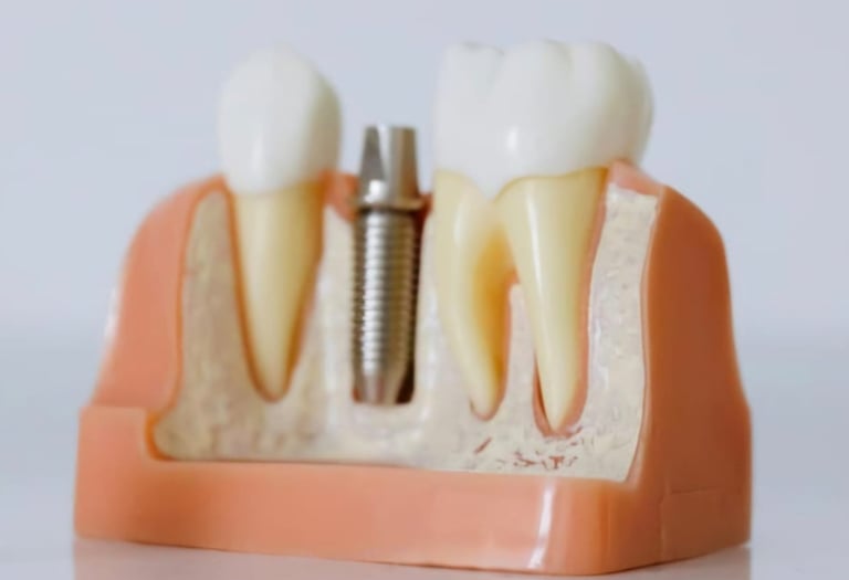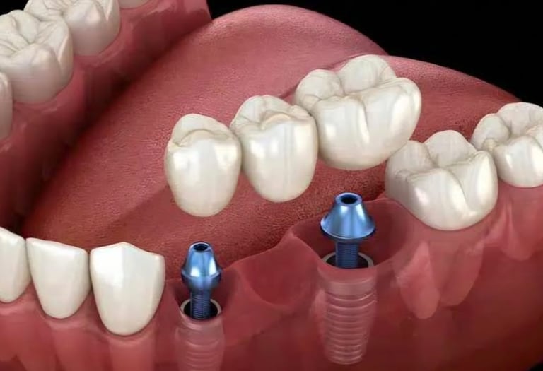 São estruturas de titânio colocadas no osso, funcionando como a "raiz" do dente perdido. Sobre eles, é fixado uma prótese que imita um ou mais dentes naturais.